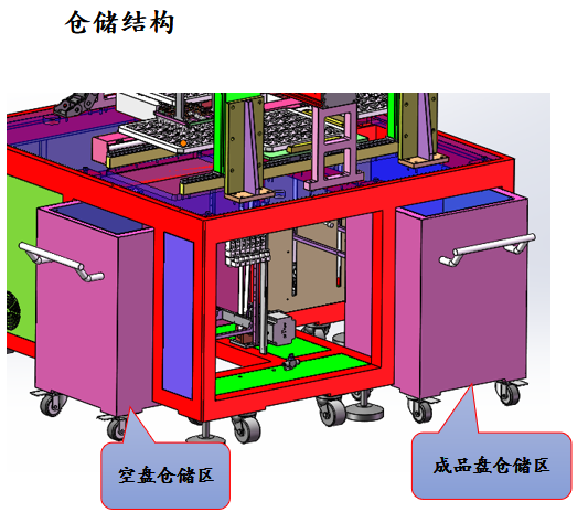 仓储托盘存放推车存放于设备内部,存放一定数量即可推走,前后各一个。